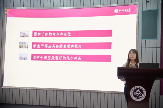 机械与材料学院辅导员赵梦彤讲述学生干部的角色和定位、应具备的素质和能力、应处理好的几个关系。她对同学们提出了一个原则、两个重点、四个方面的要求,希望大家突破自己的舒适区敢于挑战,更多地开拓自己的眼界。