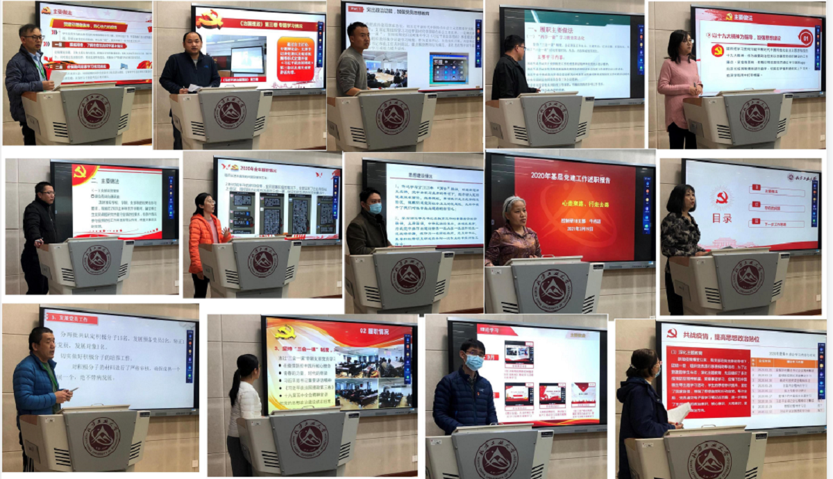 会上,各党支部书记分别从深入学习贯彻习近平新时代中国特色社会主义思想和党的十九届五中全会精神、党支部战斗堡垒和党员先锋模范作用的发挥、支部品牌活动的打造、党务和业务结合、突出查找解决问题及整改等方面作了述职,教工党支部紧密结合专业特色,融合科研育人、实践育人和课程思政;学生党支部重点围绕理论学习、“三会一课”制度落实、党员作用发挥、支部品牌活动建设、党建与学风等方面做了深入的剖析。