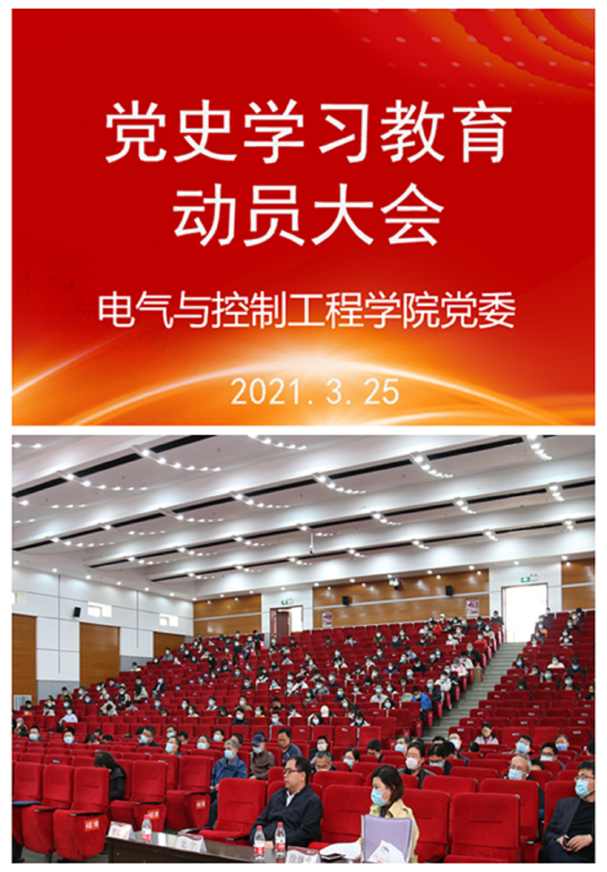 3月25日下午,电气与控制工程学院在图书信息楼报告厅召开党史学习教育动员部署大会。学院领导班子成员、全体党员和教职工300余人参加会议。