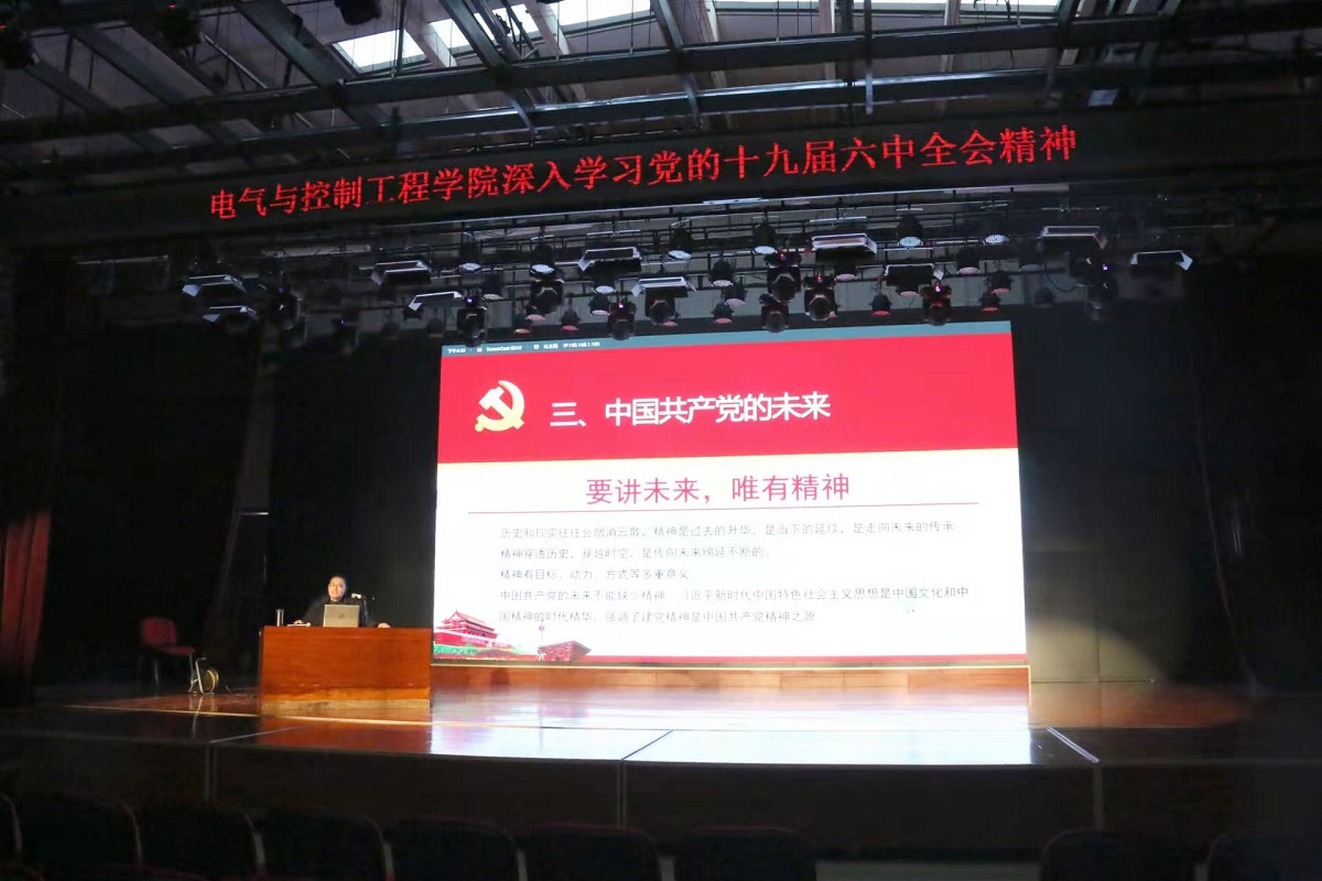 11月25日下午,电气与控制工程学院党委在学生综合服务楼多功能厅召开了学院党员大会,专题集中学习党的十九届六中全会精神。大会特邀我校党的十九届六中全会精神师生宣讲团成员、马克思主义学院周守高老师作宣讲报告,学院党委委员、全体师生党员共计300余人参加了大会,学院党委书记李颖宏主持报告会。