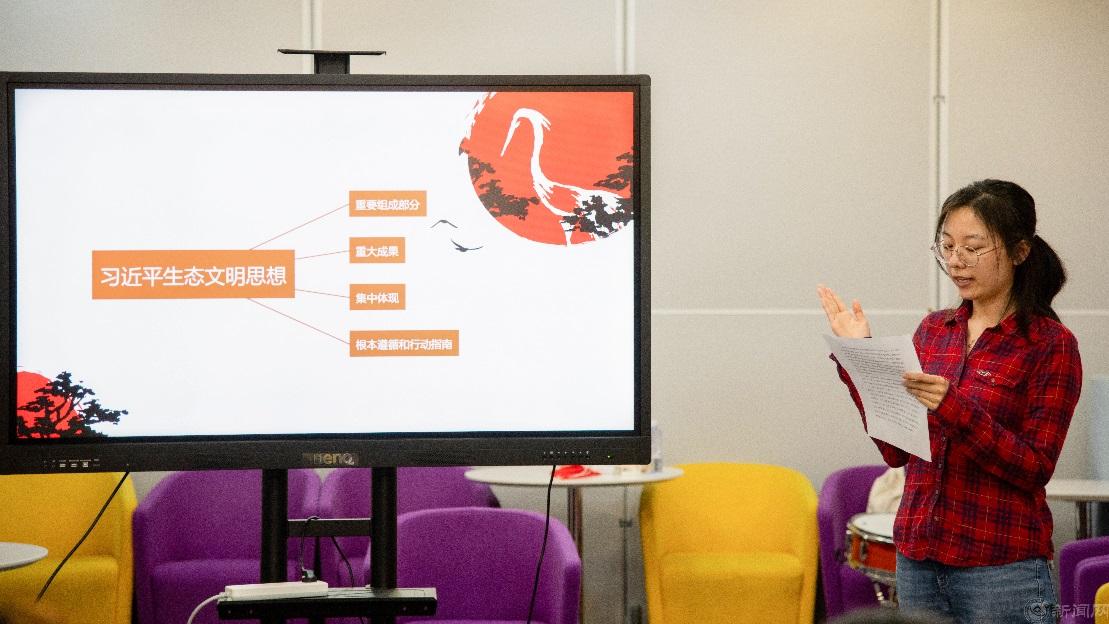 刘梦荧同学以“习近平生态文明思想的科学体系”为主题,带领大家共同学习党的二十大报告中关于推动绿色发展,促进人与自然和谐共生的生态文明思想。了解习近平生态文明思想,明晰其理论来源和现实依据,联系现实生活中的案例,深入理解习近平生态文明思想的战略路径。她认为同学们应当发挥自己的专业优势,把专业融入国家生态发展中,为建设人与自然和谐共生的中国式现代化贡献力量。