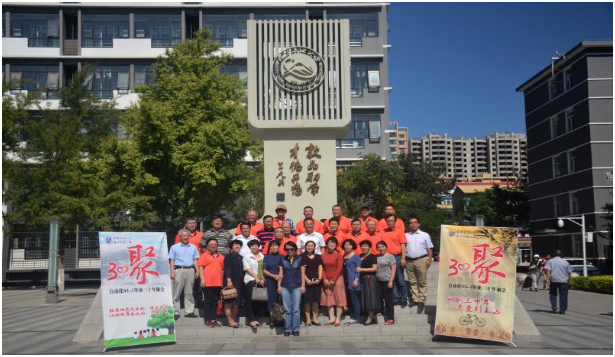参观后,院领导、全体校友在毓秀园和校训树前合影留念。