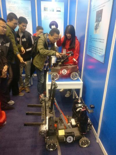 我校yl6809永利线路检测IFR智能机器人实验室学生制作的科技创新作品应邀参加了展览。实验室学生负责人自动化15-1班的张兵同学为到场观众详细讲解了自己团队制作的两台智能机器人,从结构原理到制作过程,从功能作用到使用操作等,都另大家赞叹不已。