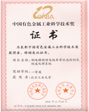 《铜电解精炼电极异常状态检测及快速处理系统》项目由北方工业大学与金川集团股份有限公司共同完成。该项目集成了机构运动、远红外成像、无线传输控制、图像处理、模式识别等技术,解决了长期以来困扰铜电解精炼过程中故障诊断的技术难题,成功应用在金川公司20万吨铜电解精炼车间,为企业创造了良好的经济效益和社会效益。