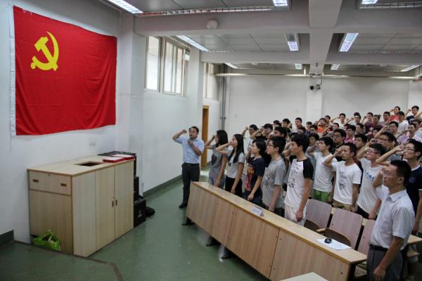 庄重严肃的《国际歌》拉开了大会的序幕,面对党旗,预备党员在学院党委委员翟维枫同志的带领下庄严的宣誓,正式党员重温了入党誓词。宣誓仪式对全体党员进行了一次生动的党性教育。