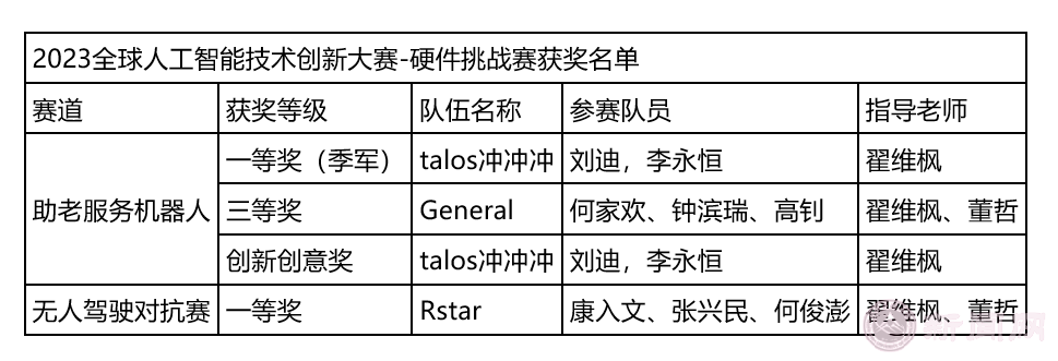 日前,2023全球人工智能技术创新大赛总决赛在杭州未来科技城梦想小镇互联网村成功举办。我校学生在比赛中表现出众,在硬件挑战赛中获得助老服务机器人赛项季军1项、三等奖1项、创新创意奖1项,无人驾驶对抗赛项一等奖1项的优异成绩,共获得主办方颁发的奖金20000余元。