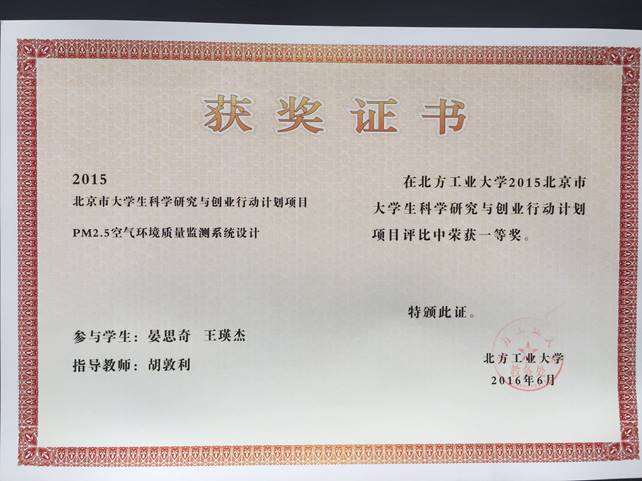 测试仪设计硬件采用MSP430系列的msp430f149为微处理器,包括PM2.5检测电路、温度检测电路、湿度检测电路、LCD显示等,测试仪自带电池,可以实现温度、湿度和PM2.5数据的实时采集显示,测试仪体积小,测量精度准确。该项目获2015北京市大学生科学研究与创业行动计划项目一等奖。2015年该项目在核心期刊 高技术通上发表论文一篇。
