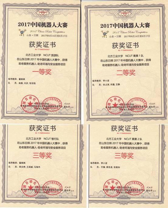 我校学生使用该机器人平台于2017年8月组织多个队伍参加了在山东日照举行的“中国机器人大赛”,在“助老服务机器人—助老环境与安全服务”分赛项中出色的完成了各项要求,最终获得一等奖一项、二等奖一项、三等奖两项的优异成绩。