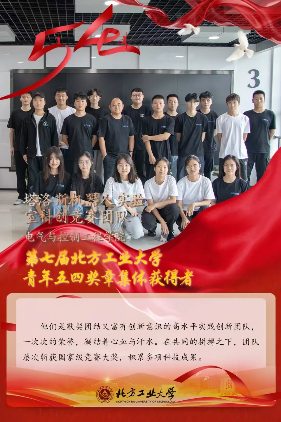 塔洛斯实验室长期组织学生参加多项高等级赛事,培养学生在智能机器人领域的科技创新精神和综合知识运用能力、基本工程实践能力,激发学生将所学知识与科技发展、社会需求、关注热点紧密结合,提高大学生科学素养,增强本科教学质量。团队在2022年获得北方工业大学“青年五四奖章”。