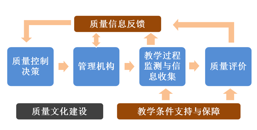 学院的教学质量保障体系目前由质量决策、管理机构、过程监测与信息收集、质量评价、信息反馈和教学条件支持与保障几个部分构成,初步实现了各模块的循环反馈机制。另有质量文化建设模块尚在建设中。