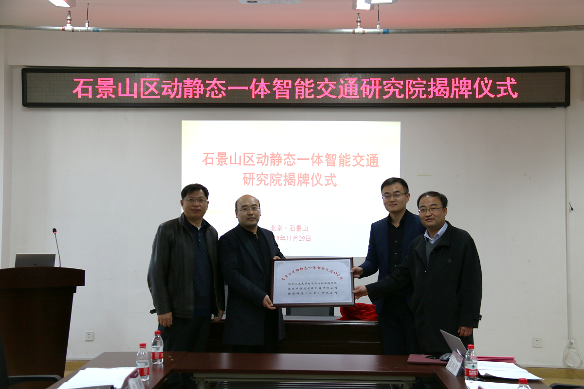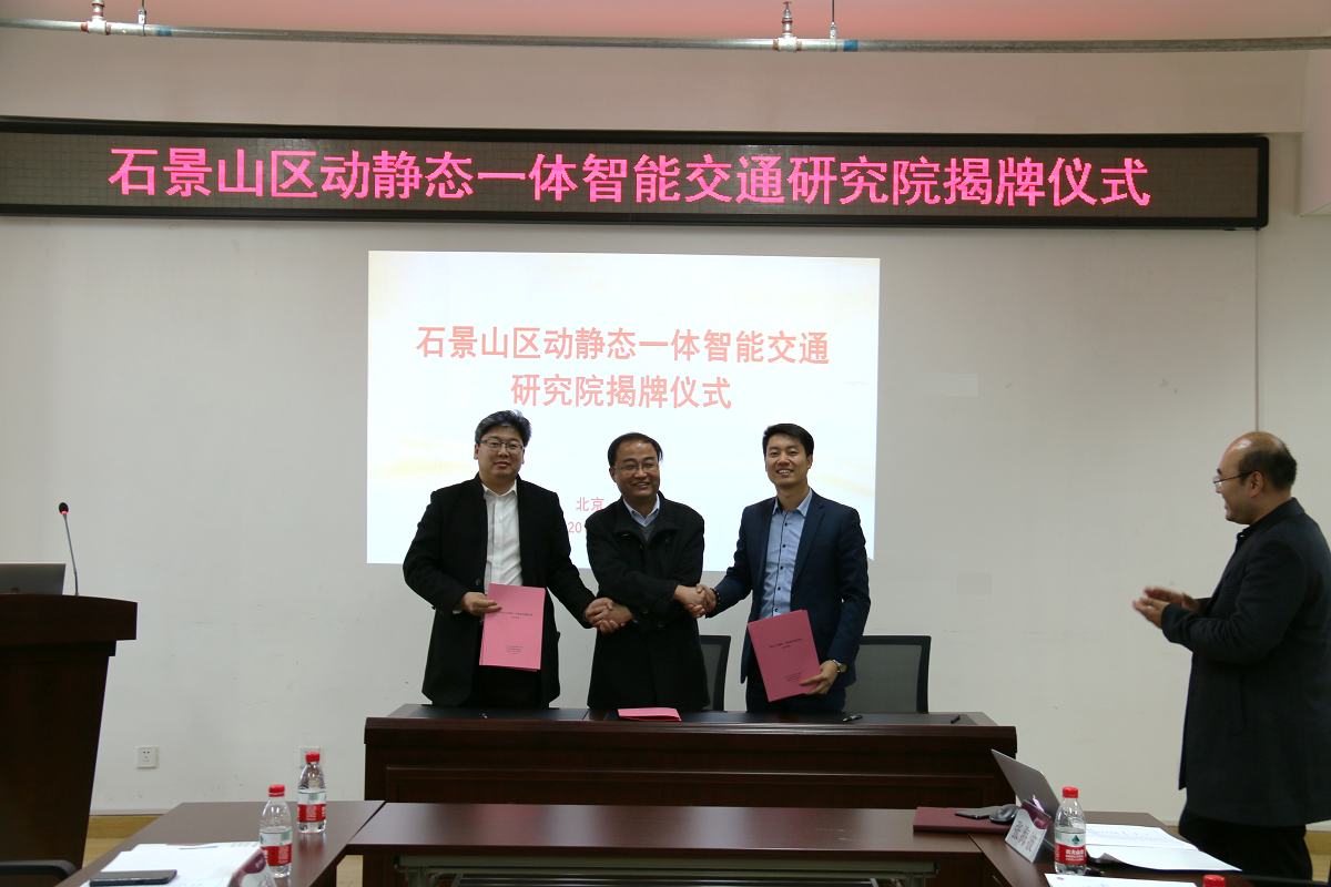 最后,王力院长、于程水总经理、汤波总经理签订了合作协议,柯军副主任、韩飞副处长、王力院长共同为“石景山区动静态一体智能交通研究院”揭牌、授牌。