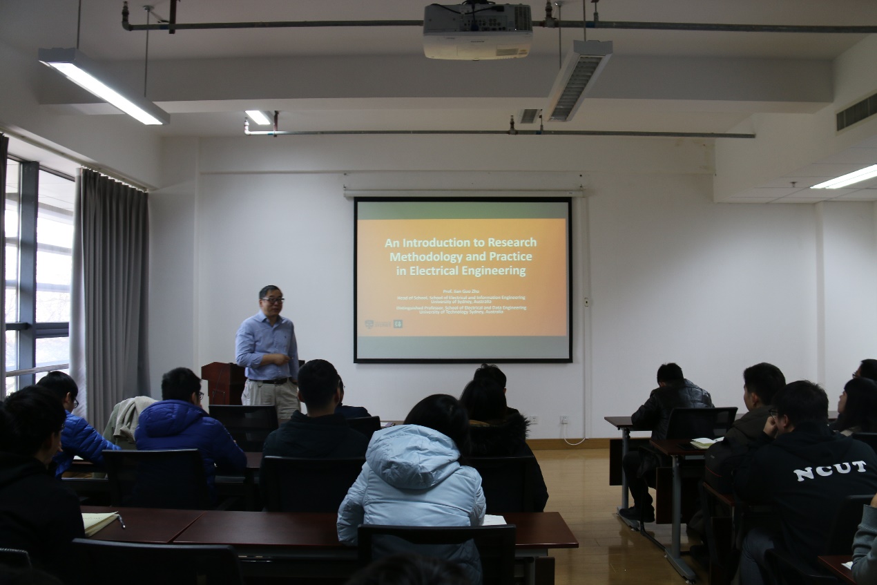 首先由张永昌老师对朱建国教授进行简短的介绍。随之朱建国教授开始了本次宣讲报告,这次报告主要分为两个部分:一、朱建国教授以PPT的形式带我们参观了悉尼科技大学(University of Technology Sydney)以及悉尼大学(University of Sydney);二、朱建国教授给我们讲述电气工程研究方法和实践简介,大致包括三方面:1、作为一名研究者应该具备什么样的态度和方法;2、怎样查找并阅读文献;3、如何选择一个好的论文题目。最后朱建国教授与师生们展开互动交流。