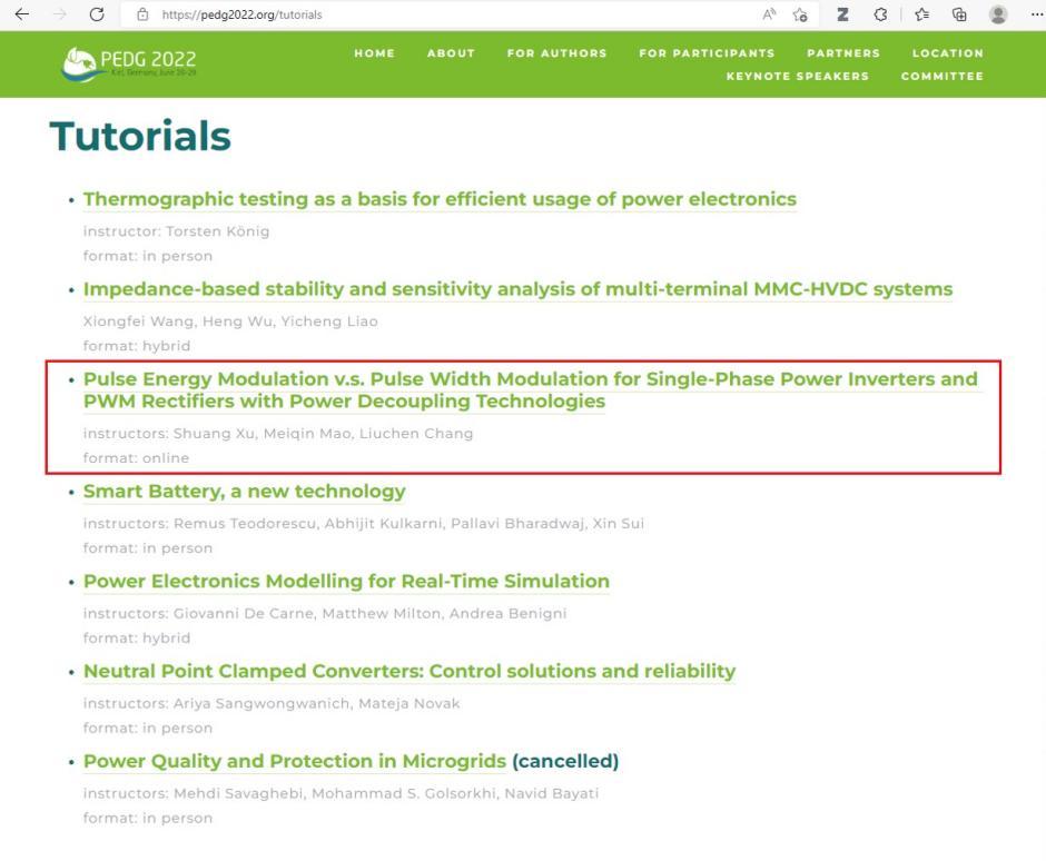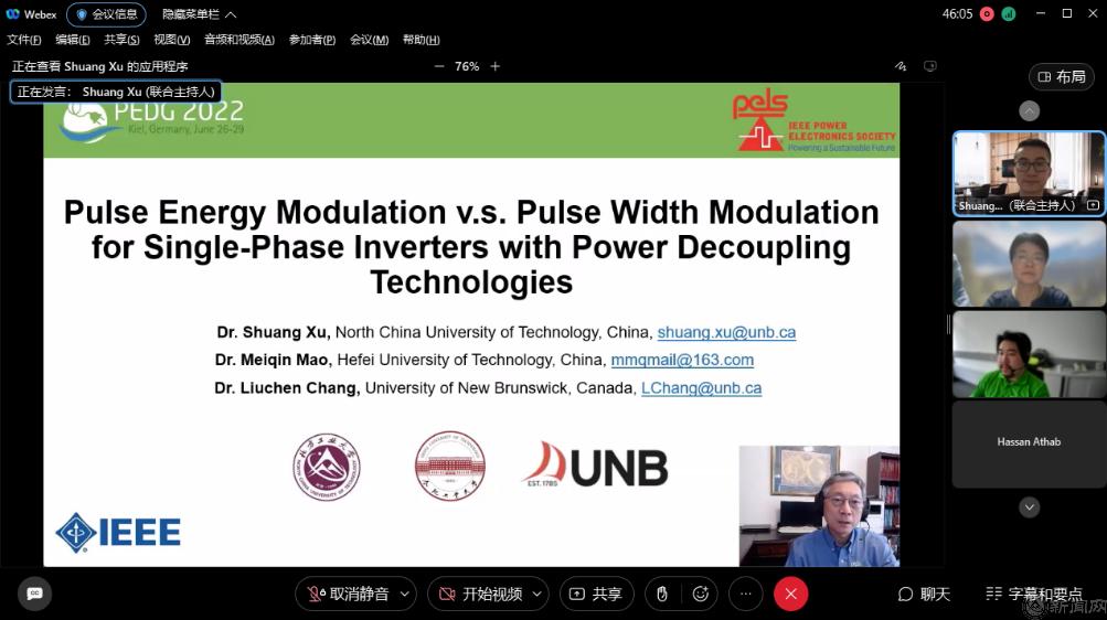 由IEEE电力电子学会主办的第十三届分布式发电系统电力电子国际会议(IEEEPEDG2022)于当地时间6月26日至6月29日在德国基尔召开,本次会议围绕“发展高效可靠的电力电子设备以致力于解决清洁能源发展”这一主题,为国内外专家学者分享领域内最新研究成果提供交流平台。我校电气与控制工程学院徐爽博士受邀以北方工业大学为第一单位,同加拿大皇家工程院院士张榴晨教授、合肥工业大学茆美琴教授一起,以“Pulse EnergyModulationv.s. Pulse Width Modulation for Single-Phase Inverters with Power Decoupling Technologies”为主题,做了时长为四个小时的线上特邀大会报告。