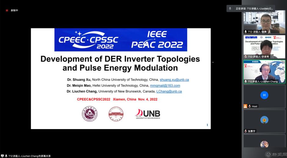 由中国电源学会主办的2022中国电力电子与能量转换大会暨中国电源学会第二十五届学术年会及展览会(CPEEC & CPSSC 2022)于2022年11月4日-7日在厦门召开,大会旨在促进电力电子、能量转换与电源技术相关领域学术、技术交流,促进产、学、研的合作,促进相关产业及产业链的技术创新和进步,为国内外专家学者分享领域内最新研究成果提供交流平台。我校电气与控制工程学院徐爽博士受邀以北方工业大学为第一单位,同加拿大皇家工程院院士张榴晨教授、合肥工业大学茆美琴教授一起,以“Development of DRE Inverter Topologies and Pulse Energy Modulation”为主题,做了时长为三个半小时的线上特邀大会报告。