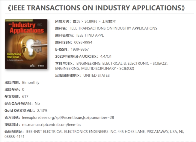 IEEE Transactions on Industry Applications是美国电气与电子工程师学会(IEEE)的老牌SCI期刊,2023年度的影响因子为4.4,JCR分区为1区,具有良好的声誉和广泛的学术影响力。IEEE Transactions on Industry Applications重点发表电气和电子工程在电气和电子工程的开发、设计、制造和应用方面的理论和实践的研究成果,是电气工程领域公认的国际著名学术期刊。