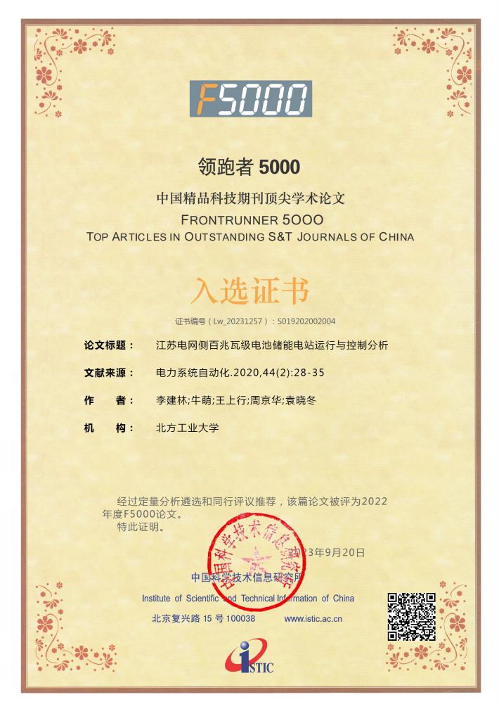 近日,科技部中国科学技术信息研究所发布了2022年度“领跑者5000——中国精品科技期刊顶尖学术论文(简称F5000)”入选名单,我校电气与控制工程学院教授李建林、周京华等发表的论文《江苏电网侧百兆瓦级电池储能电站运行与控制分析》光荣入选。