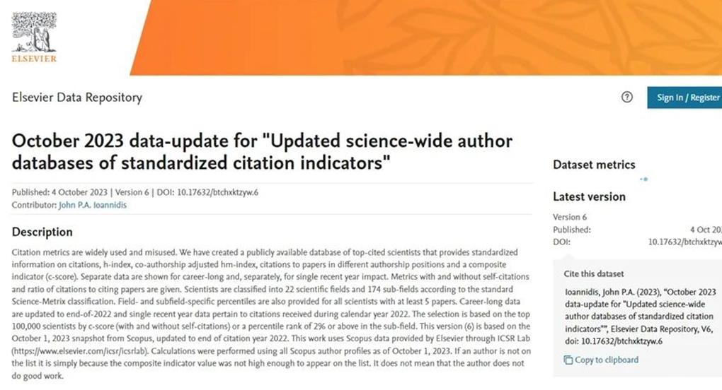 该榜单是斯坦福大学John P. A. Ioannidis教授团队与Elsevier与合作的项目成果,发布在Elsevier旗下的Mendeley Data网站上。榜单采用论文引用数、h指数、合著调整后的hm指数等6种综合指标(c-score),从近700万名科学家中遴选出世界排名前2%的科学家,反映科学家在全球范围的影响力及为相关领域发展作出的杰出贡献,入选科学家分为22个科学领域和174个子领域。