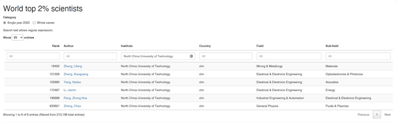 “全球前2%顶尖科学家榜单”分为“终身科学影响力榜单”(关注整个学术生涯迄今的影响力)和“年度科学影响力”榜单(聚焦本年度学术成就)。此次更新的榜单中,我校张立峰、李建林、杨海涛3位教授入选“终身科学影响力榜单”,张立峰、张晓光、杨海涛、李建林、庞中华、郑超等6位教授入选“年度科学影响力”榜单。