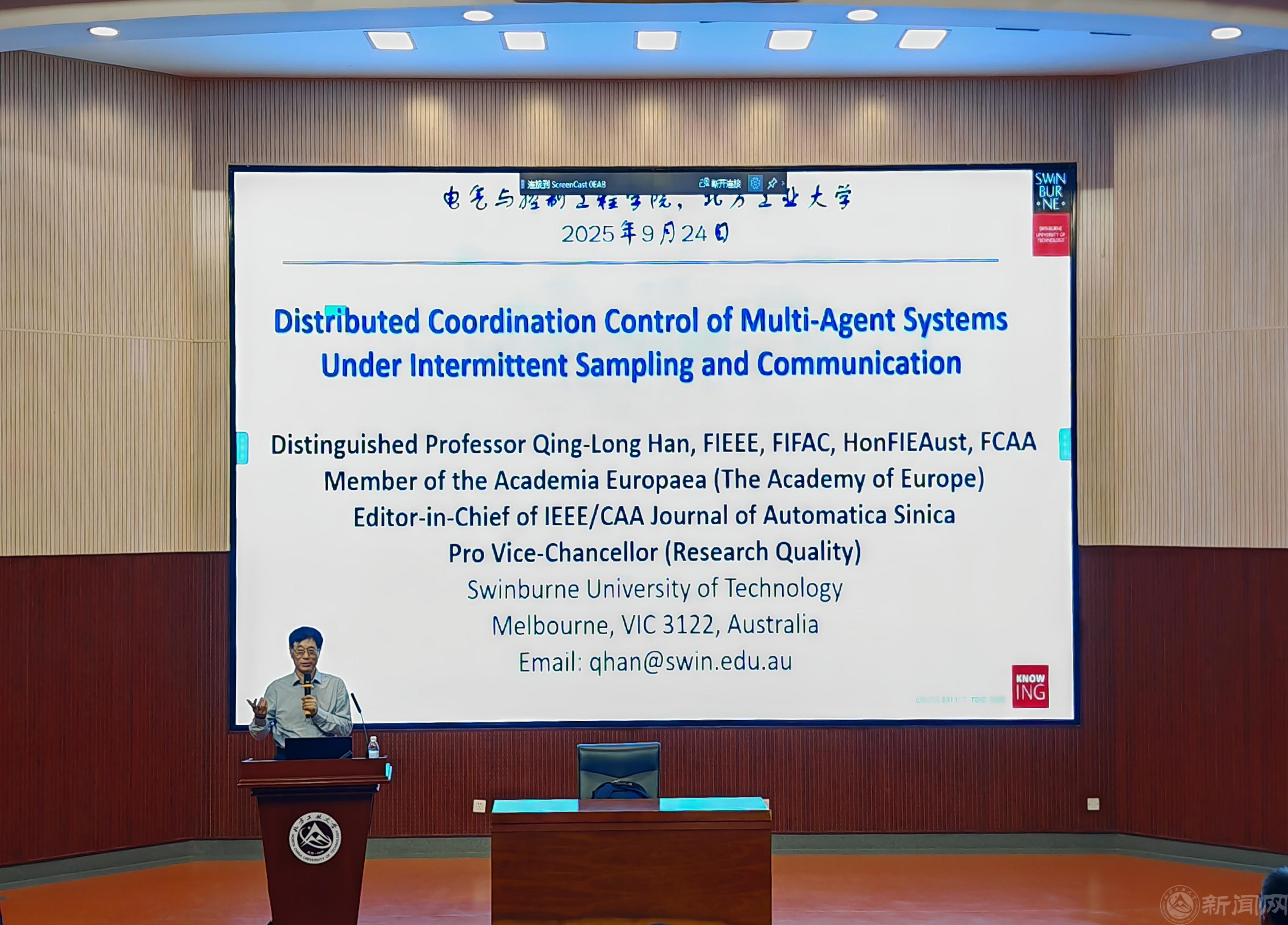 9月24日,欧洲科学院院士、澳大利亚斯威本科技大学副校长韩清龙教授在文化会堂为我校控制科学与工程学科博士新生讲授了“控制科学与工程前沿专题”开学第一课。韩清龙院士以“Distributed Coordination Control of Multi-Agent Systems Under Intermittent Sampling and Communication”为主题,为博士生带来了一场前沿学术盛宴。报告由电气与控制工程学院院长董哲主持。